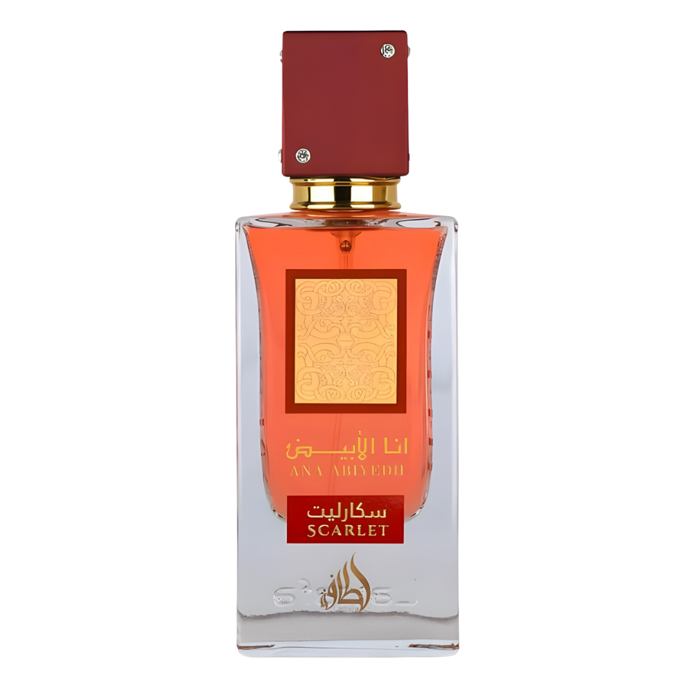 Ana Abiyedh Scarlet by Lattafa is a modern oriental fragrance combining elegance and intensity. It opens with bold fruity and bright notes before revealing a gourmand floral heart and a warm, unforgettable base. This unisex signature scent is designed for those seeking a refined, powerful, and captivating perfume.